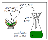 نقوم بتقطيع اوراق خضراء تقطيعا دقيقا ونضعها داخل مهراس به قليلا من الرمل الدقيق،ثم نضيف اليه مذيبا عضويا(كحول او استون)،ثم نرشحه فنحصل على محلول يدعى اليخضور الخام.