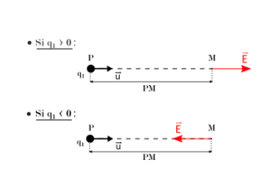 Où r=OM et est un vecteur unitaire, partant de O et dirigé vers le point M. Le champ électrostatique ne dépend pas de la charge témoin q, c'est-à-dire celle qui subie le champ créé par la charge source.