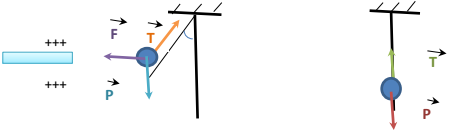 Dans la 2ème position d’équilibre, le pendule est incliné, la boule se trouve en plus du champ de pesanteur dans un autre champ appelée: le champ électrostatique dans lequel les charges positives du bâton appliquent une force appelée : force électrostatique sur les charges négatives de la boule du pendule.