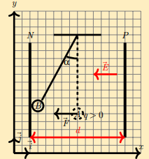 On place entre deux plaques parallélépipédique $P$ et $N$, un pendule électrostatique de charge q positive. Lorsqu’on applique une tension électrique entre les deux plaques, un champ électrostatique uniforme $E$ se crée et la charge $q$ se trouve soumise à une force électrique $\vec{F}$ = q.$\vec{E}$ ce qui la déplace d’un point $A$ vers un point $B$.