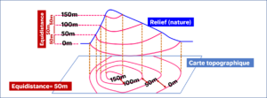 La carte topographique est la représentation des reliefs, qui dans la nature sont en trois dimensions, sur une surface plane , en deux dimensions seulement, et ainsi c’est la dimension hauteur (ou profondeur) qui va manquer dans cette représentation.