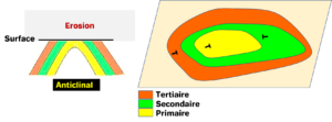 Un pli se présente au niveau d’une carte géologique sous forme de structures ovoïdes concentriques ayant des pendages opposés des deux cotés du centre (cœur du plis)