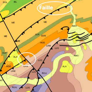 Au niveau des cartes géologiques, la faille est facilement identifiable, elle se présente sous forme de traits noirs épais.