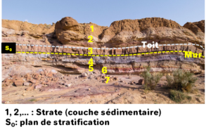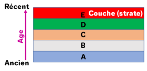 Enoncé: "Les particules présentes dans l’eau se déposent sur le fond, en général en une couche horizontale (strate). La strate la plus récente se superpose sur la précédente et la compacte."