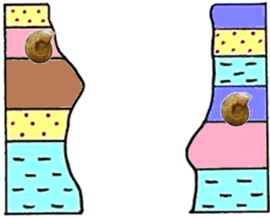 Enoncé: "Une même couche a le même âge sur toute son étendue. Deux couches séparées dans l’espace mais limités par les mêmes couches à la base et au sommet sont de même âge"