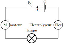 On réalise le montage électrique suivant qui est formé par un générateur branché en série avec une lampe, un moteur électrique, un interrupteur K et un électrolyseur.