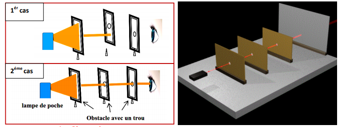 2éme cas : l’observateur voit la lumière : La lumière se propage en ligne droite.