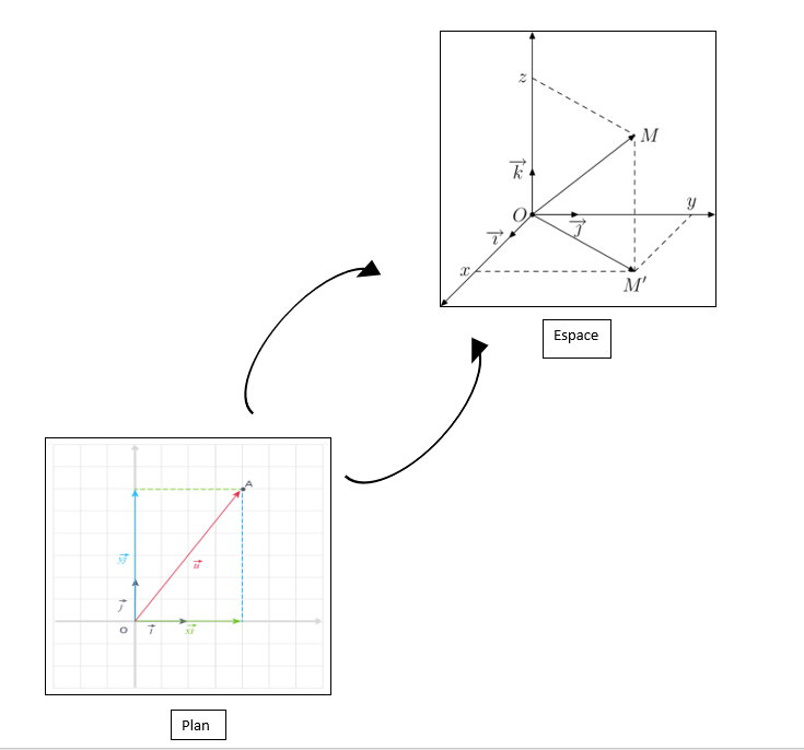 Alors, toutes ces notions sont prolongeables à l’espace, ainsi que toutes les propriétés dans le plan restent valables dans l’espace.