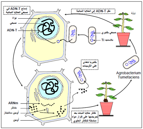انطلق التفكير في إمكانية تغيير صفات الكائن الحي بتعديل دخيرته الوراثية من دراسةالتغير الوراثي الذي يحدث طبيعيا لدى بعض الكائنات الحية.تتوفر البكتريا المتطفلة على جزء حلقي من ADN مستقل عن ADN البكتريا، نسميه بلاسميد. وهو يعتبر العنصر المسؤول عن إصابة الخلية النباتية العائلة، ويمكن هذا دخول هذا الجزء من الADN ،الذي يعتبر مسؤولا عن التكاثر الخلوي،من الحصول على نتيجتين: تكاثر البكتريا وتكاثر الخلايا العائلة بشكل عشوائي وهو ما يعطي مفهوم الورم (سرطان).تمثل الوثيقة التالية معطيات حول إصابة نوع نباتي بورم على مستوى المنطقة الرابطة بين الجذر والساق والتي نسميها السنخ، وتأكد التدخل المباشر لنوع من البكتريات غير القادرة على التكاثر طبيعيا بل فقط عند تطفلها على هذه النباتات.يتم التفاعل بين البكتريا والخلية العائلة بالشكل الذي تلخصه الوثيقة التالية:مكن هذا النقل الطبيعي للمورثات من خلية إلى أخرى من استخلاص مبدأ الهندسة الوراثية:إن الذخيرة الوراثية للخلية قابلة للتعديل إما إضافة أو نقصان، ويؤدي كل تغيير في النتيجة إلى :