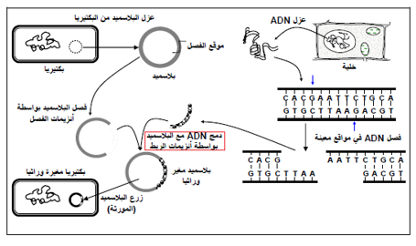 بعد عزل المورثة المرغوبة يتم غدماجها داخل بلاسميد بكترية تكون غاليا Escherichia coli لكونها تتوفر من جهة على أكثر من بلاسميد واحد ومن جهة أخرى سرعة تكاثرها كبيرة.