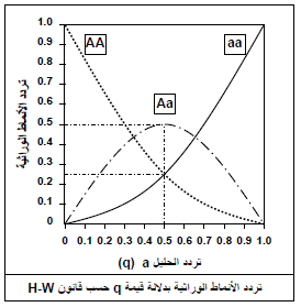 بما أن مجموع ترددات مجموع الحليلات مساو للاحتمال 1 وهو نفس احتمال مجموع ترددات جميع الأنماط الوراثية، فإن هذا يعني أن تغير تردد كل حليل هو مرتبط بتغير تردد الحليل الثاني داخل نفس الساكنة، ويوضح المبيان التالي العلاقة بين تطور الترددات فيما بينها وترددات الحليلات عند انتقال مورثة في حالة السيادة التامة.