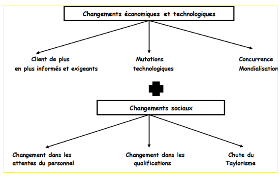 Ces dernières années sont marquées par l’accentuation et l’internationalisation de la concurrence, le ralentissement de la croissance économique ou même la crise financière et économique, la saturation des marchés et aussi des mutations sociales (exemple : développement du syndicalisme). Ces changements imposent à l’entreprise des efforts en termes d’innovation, de flexibilité, de productivité et de qualité. Pour conserver sa compétitivité dans ce contexte, l’entreprise doit mobiliser tout le potentiel de ses hommes : leur imagination, leur professionnalisme, leur motivation, leur responsabilité, leur autonomie, leur capacité d’évoluer.