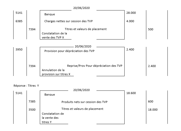 Exemple : Le 20.06.2020, l’entreprise « said & associés » procède à la cession de tous ses titres X au prix unitaire de 350 DH, et tous ses titres Z au prix unitaire de 370 DH. Le paiement se fait le jour même par virement bancaire.