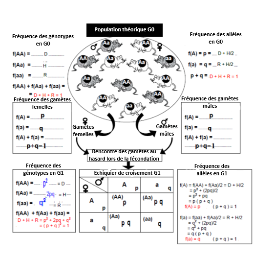 La loi H-W suppose que les fréquences alléliques dans une population sont conservées si la dite population remplie les conditions de la population idéale et théorique: on dit alors qu'elle en équilibre (génétique). L'exercice suivant présente la démonstration de cette loi. Le schéma suivant résume l’interprétation de la loi H-W :