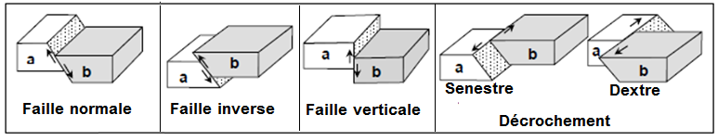 Suivant la nature des contraintes (compressives ou extensives) et selon la direction de la faille et le sens de déplacement des compartiment séparés on peut distinguer :