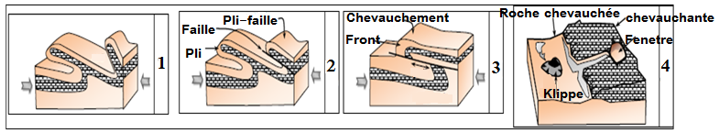 Représentent une catégorie particulière des déformations tectoniques où les failles et les plis coexistent. L’exemple le plus étudié de ses déformations est la nappe de charriage, liée à un régime compressive, son existence au niveau des chaines de montagnes récentes implique la migration de couches géologiques sur de longues distances pour se déposer en dessus d’autres couches, qui généralement leur sont plus récentes.