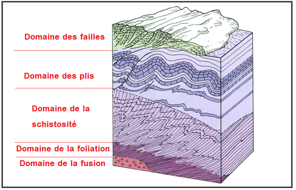 De façon générale, la répartition des déformations géologiques suit le modèle suivant :
