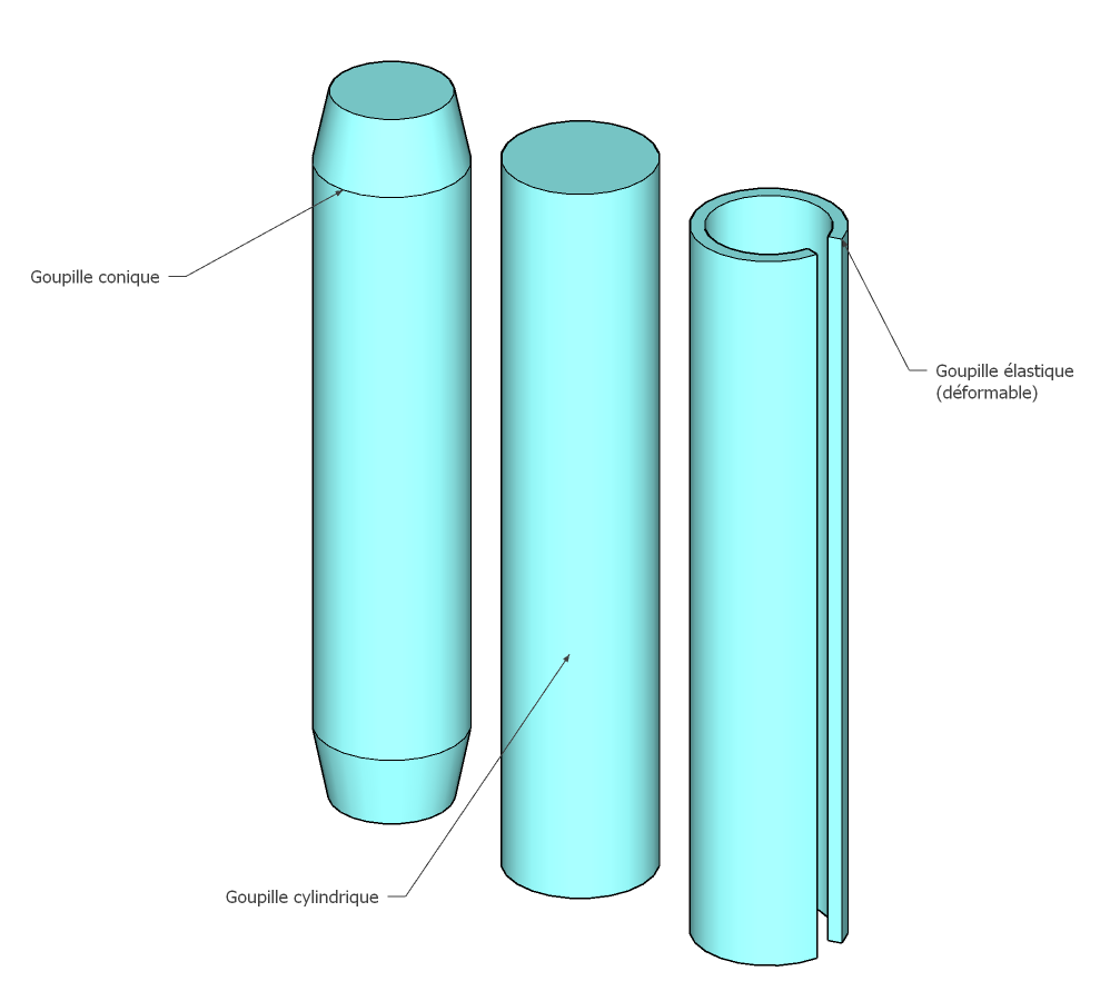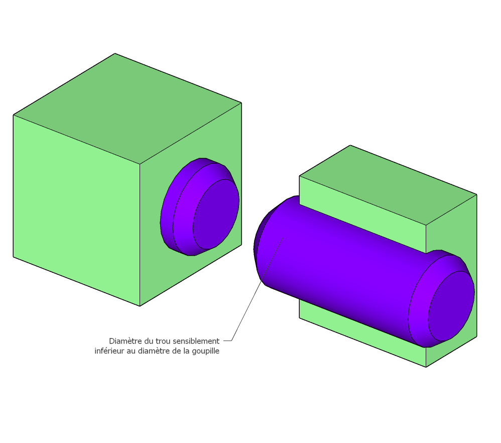Encastrement par goupille, la MIP se fait à travers la surface cylindrique de contact entre la goupille et les éléments assemblés, le MAP est assuré par la goupille elle-même.