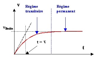 Tant que v est constante alors : $$\frac{d \mathrm{v}}{d \mathrm{t}}=0$$ et $$v=v_{l i m}$$, l’équation différentielle devient :