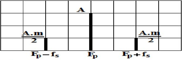 $\mathrm{u s(t)=A \cdot \cos \left(2 \cdot \pi \cdot F_p \cdot t\right)+\frac{A \cdot m}{2} \cdot \cos \left(2 \cdot \pi \cdot\left(F_p-f_s\right) \cdot t\right)} \\ +\mathrm{\frac{A \cdot m}{2} \cdot \cos \left(2 \cdot \pi \cdot\left(F_p+f_s\right) \cdot t\right)}$
