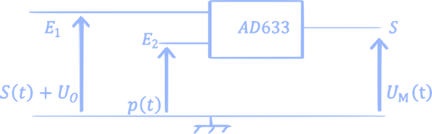 Pour moduler l’amplitude de l’onde porteuse P(t), on utilise un multiplieur X (circuit intégré AD633) qui réalise le produit du signal porteur p(t) par le signal modulant $$\left[\mathrm{s}(\mathrm{t})+U_{0}\right]$$, signal informatif décalé. Avec : s(t) : représente signal à transmettre (information) et $$U_{0}$$ : une tension continue nommée tension de décalage.