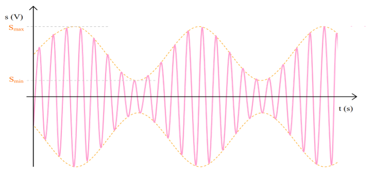 Et $$\mathrm{U}_{\mathrm{s}}(\mathrm{t})=\mathrm{A}\left[\mathrm{m} \cos \left(2 \pi \mathrm{f}_{\mathrm{s}} \mathrm{t}\right)+1\right]$$ avec :
