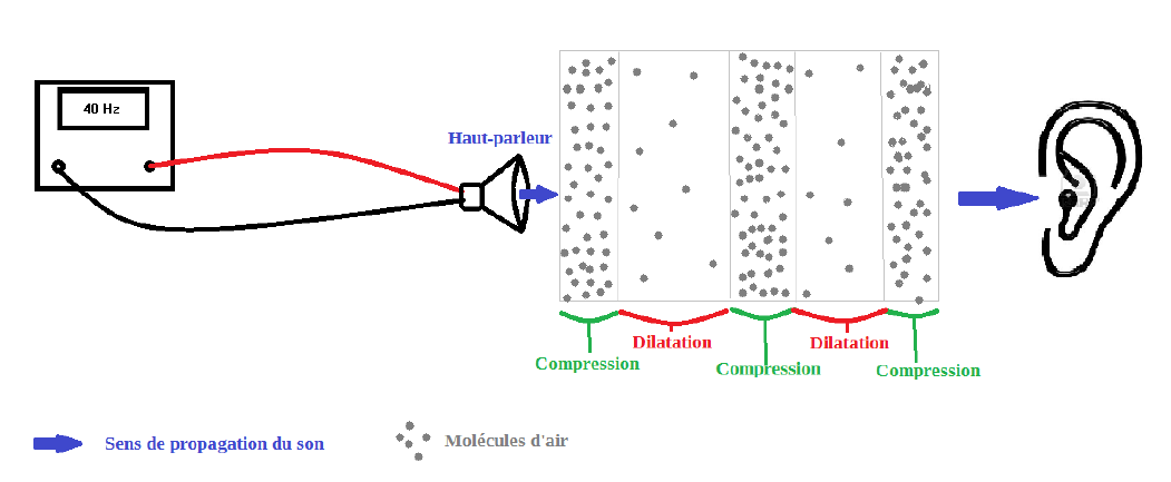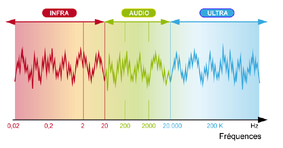 L'oreille humaine perçoit des ondes sonores dont la fréquence f est comprise entre $20 \mathrm{~Hz}$ et $20000 \mathrm{~Hz}$.