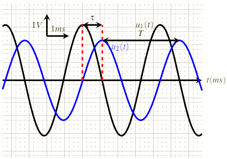 On appelle $$\tau$$ le décalage horaire entre u(t) et i(t), la mesure directe de $$\tau$$ à l’oscilloscope permet d’évaluer la valeur absolue de la phase $$\varphi_{u}$$