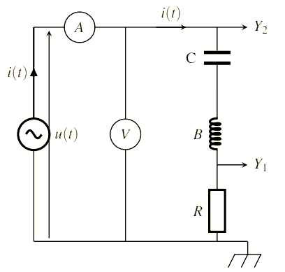 On appelle le circuit (R, L, C) série le résonateur et le générateur GBF excitateur Les deux entrées $$Y_{1} \text { et } Y_{2}$$ de l’oscilloscope, nous permet de visualiser la tension $$U_{R}(t)$$ aux bornes du conducteur ohmique et la tension u(t) aux bornes du circuit (R, L, C)