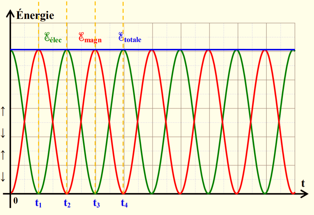 On tient à préciser que l’énergie emmagasinée dans le condensateur est une énergie électrique ainsi que l’énergie emmagasinée dans la bobine est une énergie magnétique, l’énergie totale résultante est la somme des deux énergies