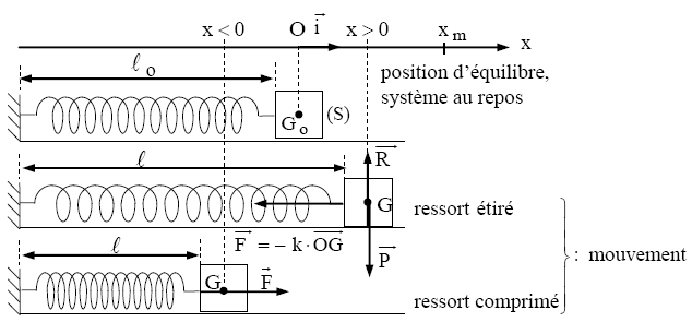 $$\overrightarrow{\mathrm{F}}=-\mathrm{k} \cdot \overrightarrow{\mathrm{OG}}=-\mathrm{k} \cdot \mathrm{x} \cdot \overrightarrow{\mathrm{i}}, \quad\left(\mathrm{F}_{\mathrm{x}}=-\mathrm{k} \cdot \mathrm{x}\right)$$