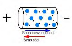 Dans les conducteurs métalliques, le courant électrique est un déplacement des électrons dans le sens contraire du sens conventionnel.