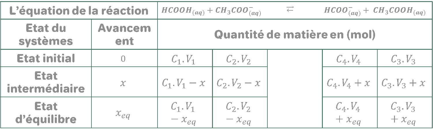 1. l’équation de la réaction entre l’acide HCOOH et la base $$ \mathrm{CH}_{3} \mathrm{COO}^{-} $$