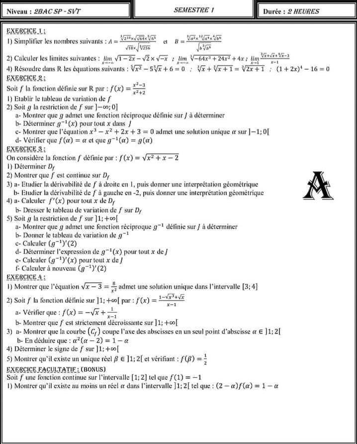 Devoir : Limites et continuité, Dérivabilité et étude des fonctions